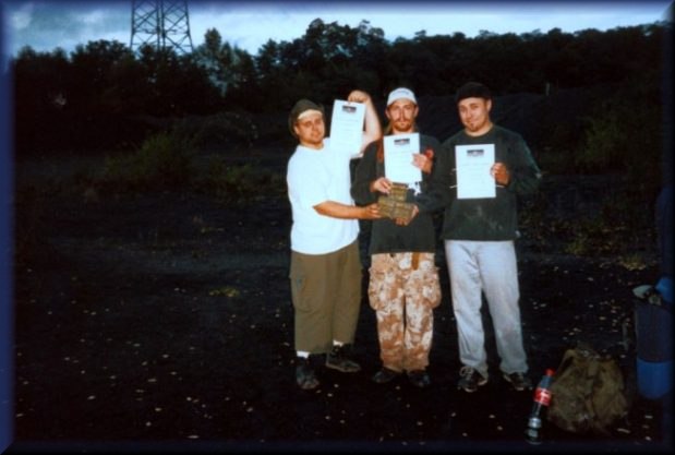 Die drei Sieger der DDR-Open 2001 Nr. 1 gammel Nr. 2 Benny Nr. 3 Knobi mit ihren Mauerstein-Pokalen.